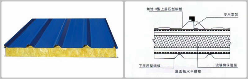新疆彩鋼玻璃棉夾芯屋面板構(gòu)成玻璃絲綿夾芯板室上下兩層彩色壓型板通過龍骨和玻璃絲綿組合而成。