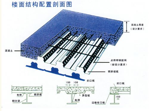 3、組合板的厚度不應小于90mm;壓型鋼板頂面以上的混凈土厚度不應小于50mm。